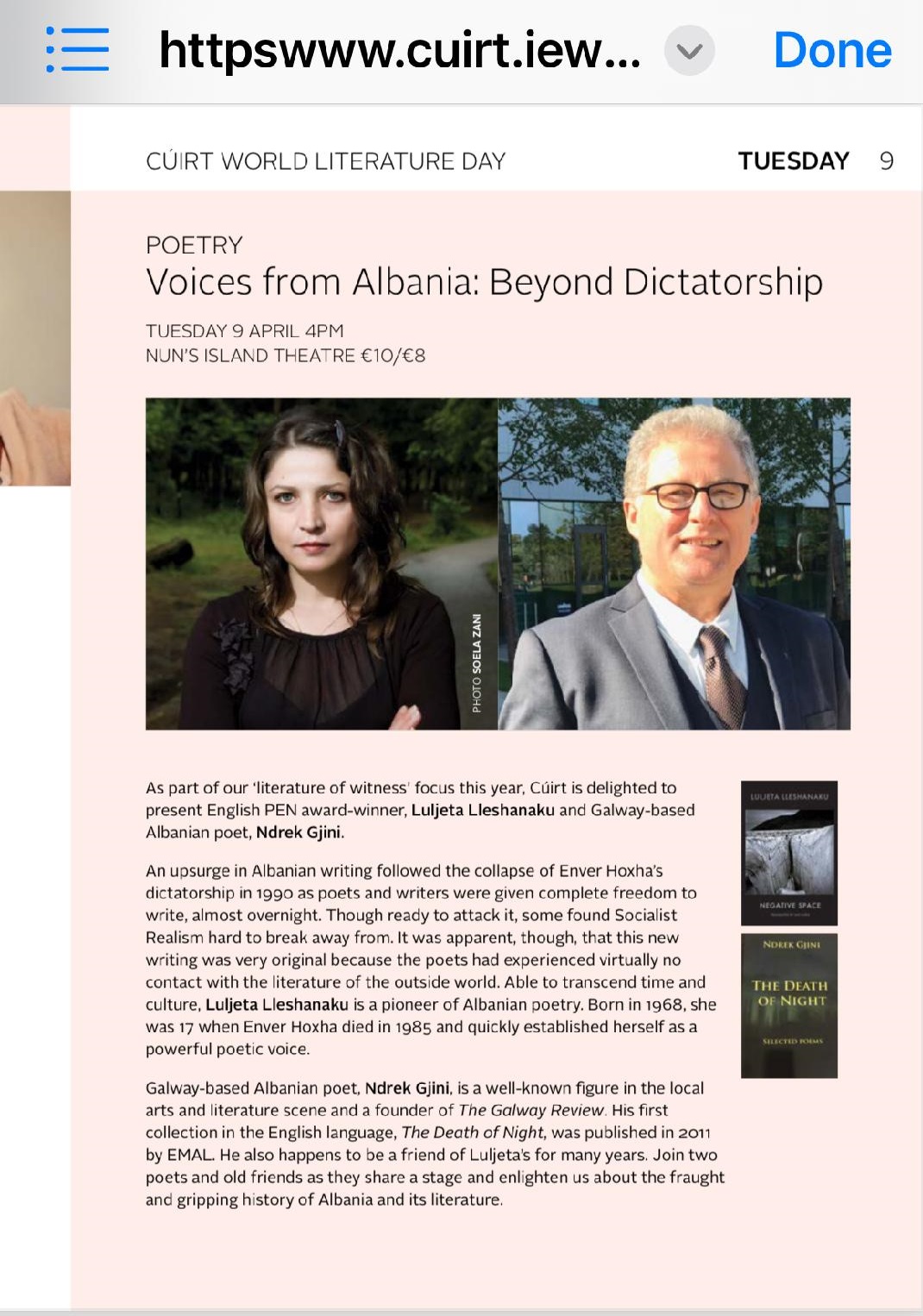 Ndrek’s first collection of poems in the English language, The Death of Night, was published in 2011 by EMAL, and his second book The Invention of Shoes was published in 2019 by Galway Academic Press. He was selected to read at the Curit International Festival of Literature in 2019, the Strokestown International Poetry Festival in 2011, and was a featured poet in the ‘Cyphers’ Magazine, Issue 71. and 85 . His work has also been published in The Mayo Anthology (Present Tense), in 2006, and in the Writing4all Anthology, “The best of 2011”, MUSE INDIA, Issue 76, 2017, ‘The Connaught Telegraph’, ‘Galway Advertiser’, ‘Galway City Tribune’, and ‘Sin’ are among other newspapers and magazines where his work has been featured. He has been invited to read at the Galway- Mayo Institute of Technology on both Galway and Castlebar campuses and at the Culture Night events.